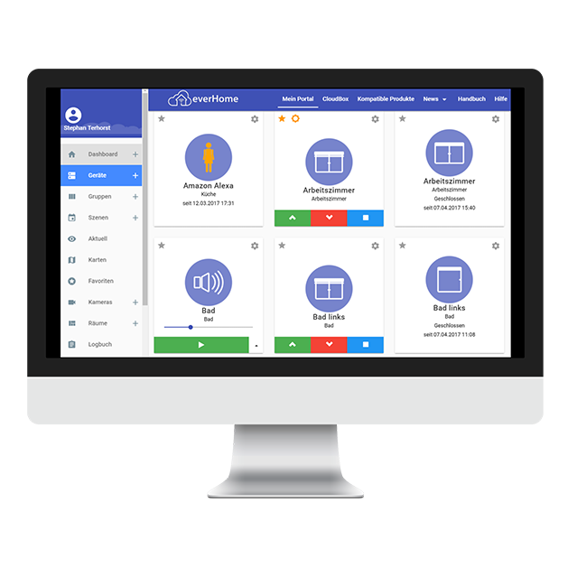 Richten Sie ihr SmartHome bequem und übersichtlich im everHome Portal am Browser ein. Fügen Sie den Räumen Sensoren und Aktoren hinzu und hinterlegen Sie Wohlfühltemperaturen für jeden Raum und jede Uhrzeit. Steuern Sie die Beleuchtung und ihre Rollläden und Jalousien nach Uhrzeit und Sonnenauf- und -untergang. Passen Sie das Dashboard nach ihren Bedürfnissen an. Über das Logbuch haben Sie immer einen guten Überblick über ihr Heim.