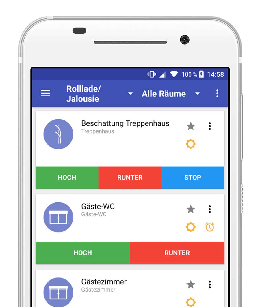 Automatisieren Sie die Beleuchtung nach Uhrzeit und Sonnenauf- und -untergang. Lassen Sie die Rollläden eine Stunde nach Sonnenuntergang herunterfahren. Legen Sie die Wohlfühltemperatur für jeden Raum individuell fest.