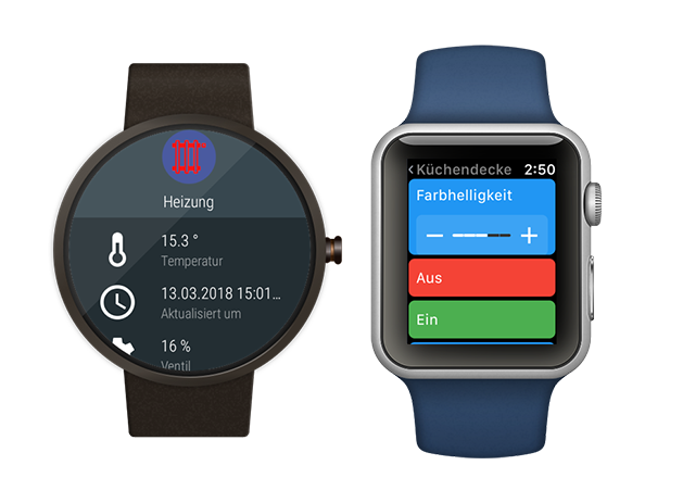 Schalten Sie ihre Geräte, Gruppen und Szenen bequem über die SmartWatch. Steuern Sie über ihre Uhr Beleuchtung, Jalousien, Raffstores, Markisen und die Heizung. Inszenieren Sie bequem Szenen. Passen Sie bei besonderen Gelegenheiten die Wohlfühltemperatur eines Raumes an. Wechseln Sie die Farbe ihrer stimmungsvollen RGB Beleuchtung.