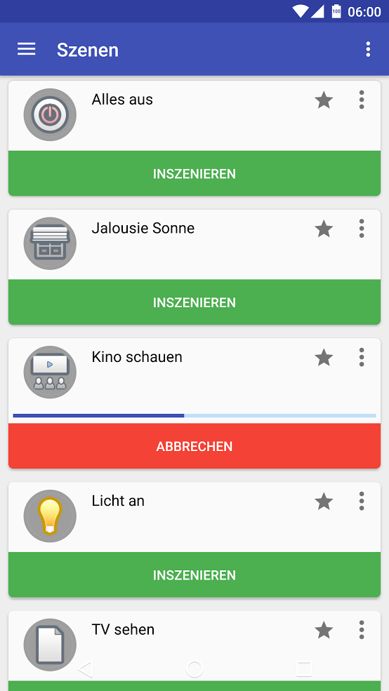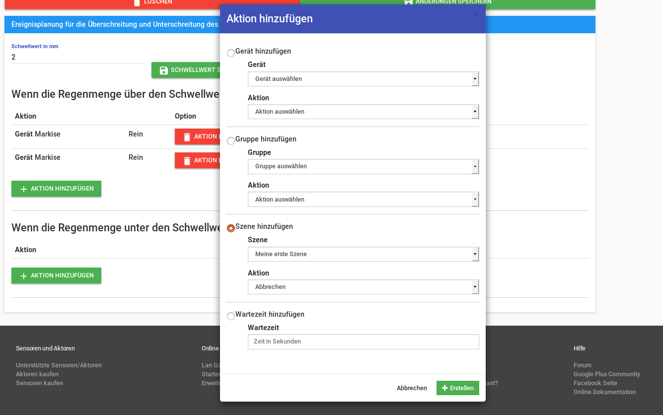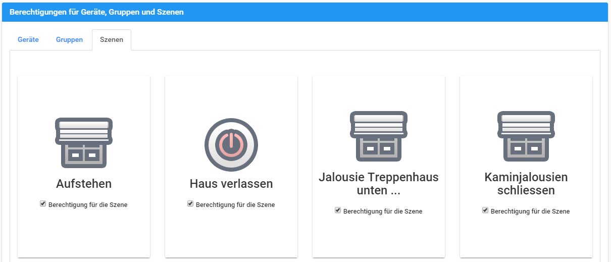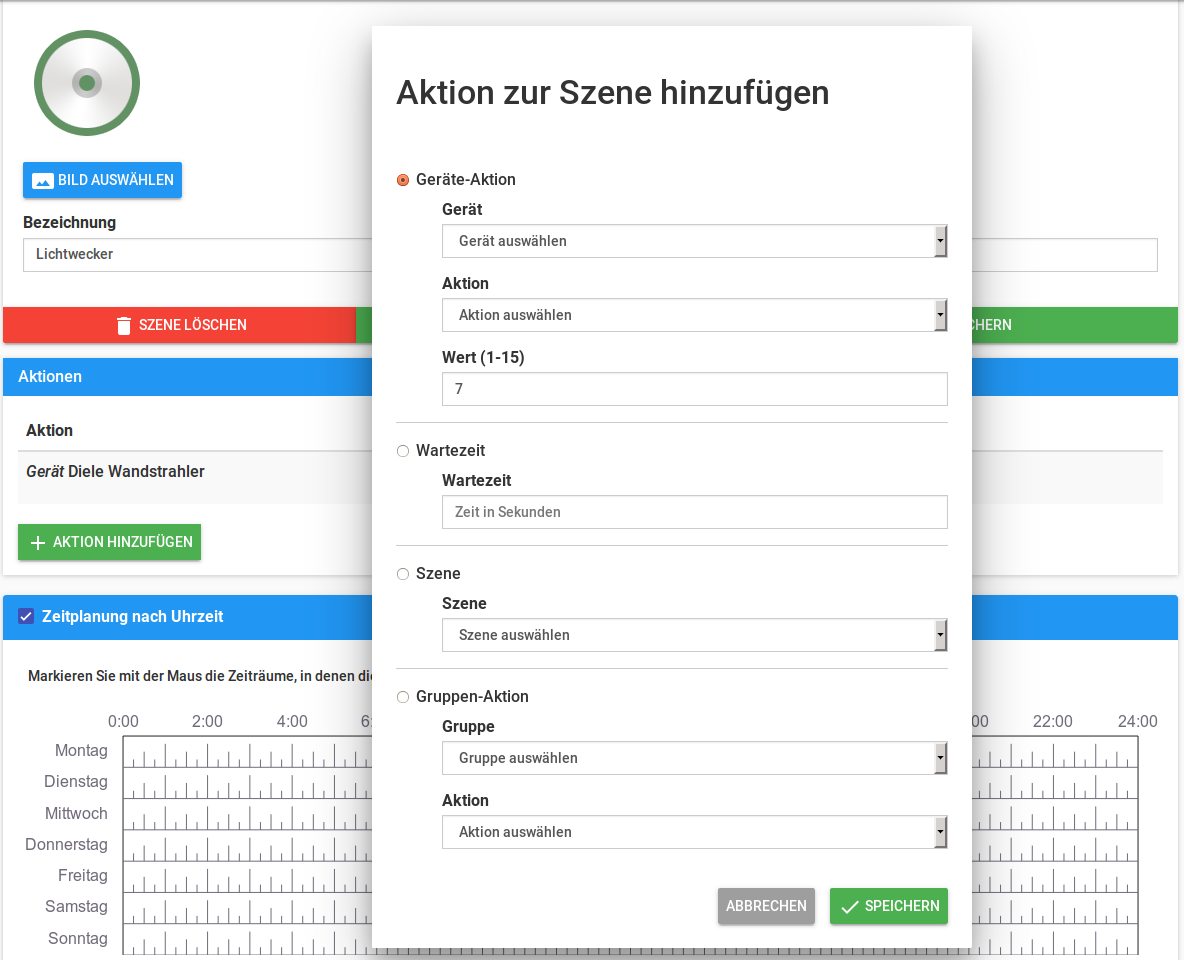 Eine Szene besteht aus einer oder mehrerer Aktionen für ein oder mehrere Geräte. Neben diesen Aktionen sollen auch Wartezeiten (in Sekunden) als Element einer Szene möglich sein. Beispielsweise kann man dann eine Jalousie HOCH fahren lassen und nach 10 Minuten automatisch wieder RUNTER fahren lassen.