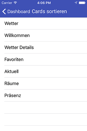 Im Dashboard der everHome App für Android kann festgelegt werden, welche Card in welcher Reihenfolge angezeigt werden soll