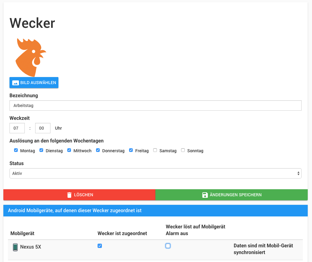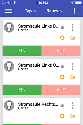 In der Geräte Übersicht unter der Menueauswahl 'Geräte' werden alle Geräte als Cards angezeigt. Ist für ein Gerät eine Zeitplanung hinterlegt, so wird dieses durch ein Uhrzeit-Symbol auf der Card angezeigt. Ist für ein Gerät eine Planung nach Sonnenauf- und -untergang vorhanden, so wird dieses durch ein Uhrzeit-Symbol auf der Card angezeigt.