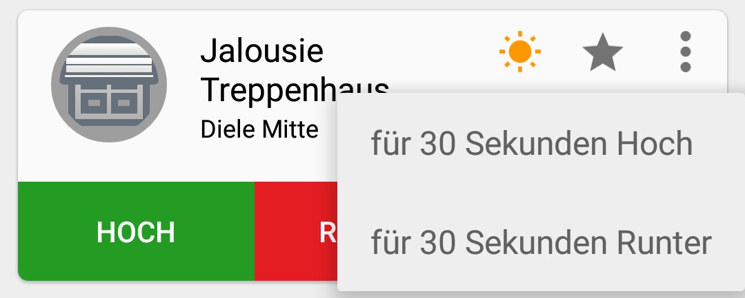 Heute schon können Rohrmotor24 Funk-Rohrmotoren und Funk-(Einbau)schalter mit der everHome CloudBox gesteuert werden. Betreibt man anstatt Rolllädenanlagen jedoch Jalousien, so hat bisher eine wichtige Funktion gefehlt: Die Möglichkeit, die Jalousie-Lamellen in Ihrer horizontalen Ausgangslage zu kippen. Diese Jalousie-Funktion wird nun in everHome für Rohrmotor24 Geräte möglich gemacht. Durch kurzes Tippen auf die Schaltfläche im everHome Portal oder in der everHome App lassen sich die Jalousie-Lamellen verstellen. Durch langes Betätigen der Schaltfläche RUNTER wird die Jalousie bis zur Endabschaltung RUNTER gefahren. CloudBox Firmware 4.0.8 oder höher erforderlich.