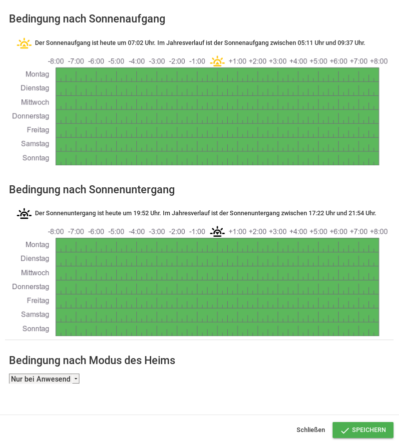 Bisher schon können Szenen nach einem Zeitplan inszeniert werden. Dies wird um die Möglichkeit erweitert, Szenen auch x Minuten nach/vor Sonnenaufgang/Sonnenuntergang inszenieren zu lassen.