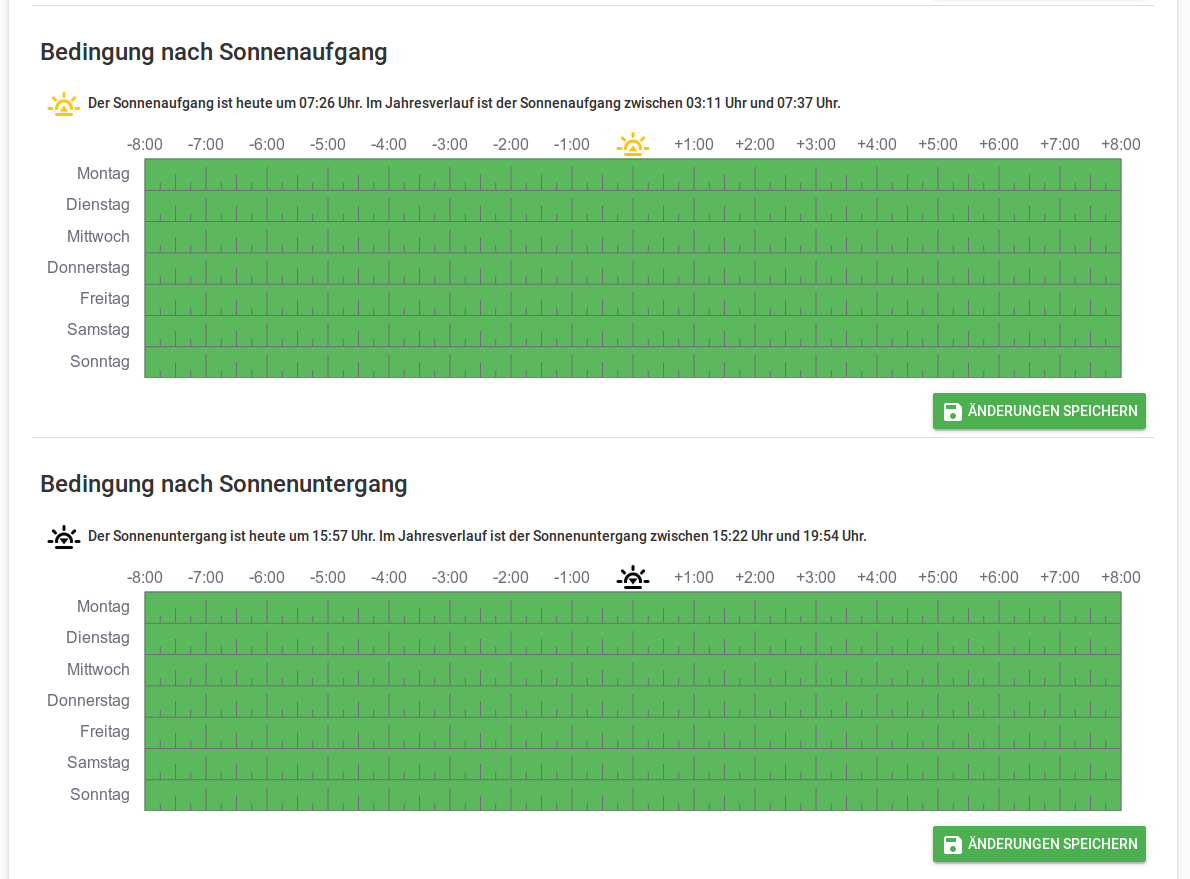 Nun lässt sich auch für Gruppen eine Zeitplanung nach Uhrzeit und Sonnenstand (Sonnenaufgang, Sonnenuntergang) hinterlegen.